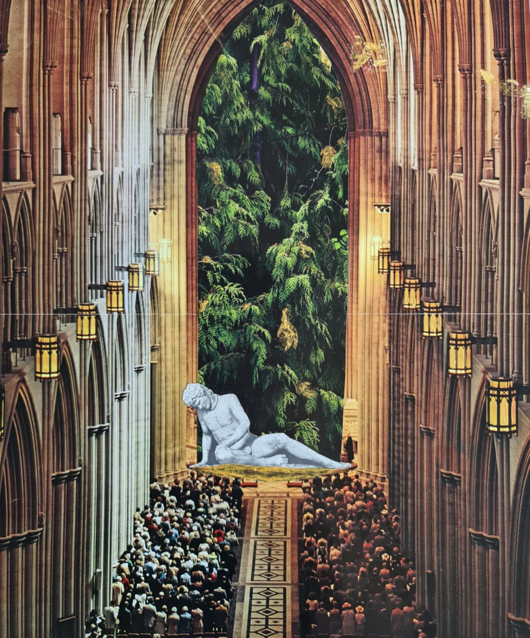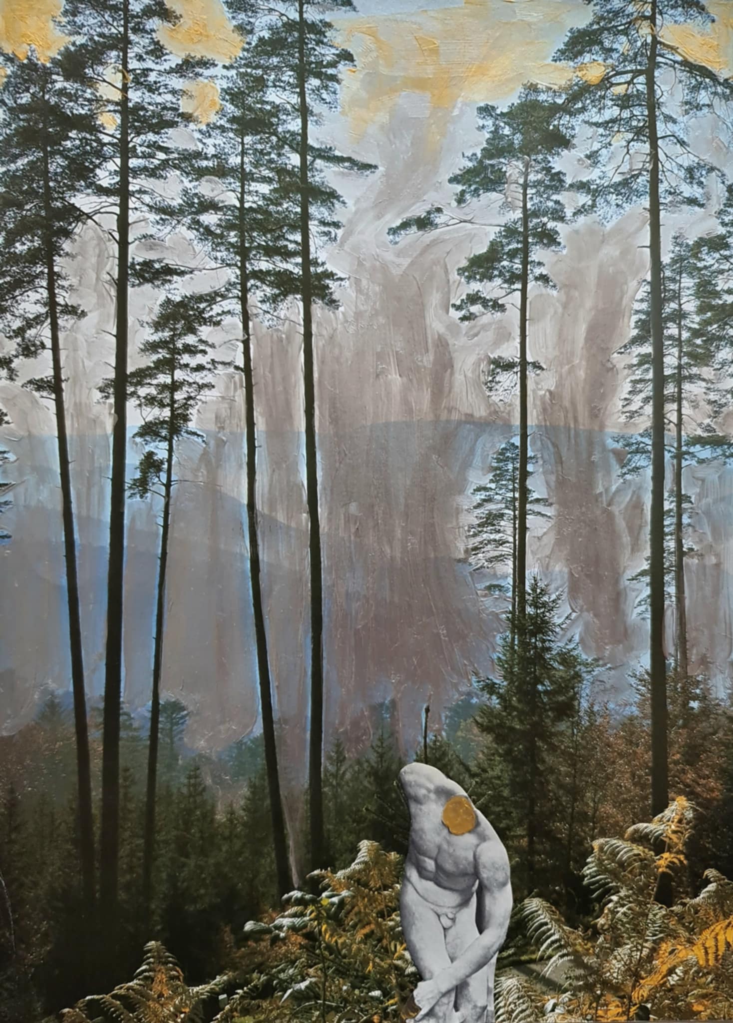 French Collages is a visual exploration of the fragile relationship between human perception and the natural environment. Built through acts of reclamation, these collages are made from rediscovered images and discarded papers, gifted to me or gathered from various locations in France. Accented with gold and silver acrylic paint, they reflect the dual nature of human engagement with landscape: both destructive and reverential.